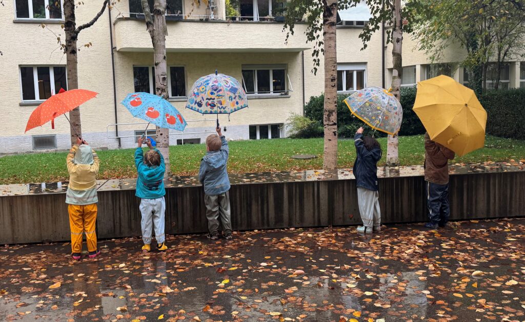 Unter dem Motto: «Es gibt kein schlechtes Wetter, nur schlechte Kleidung!» gehen wir täglich nach draussen und erleben jede Jahreszeit und jedes Wetter gemeinsam mit den Kindern ganz bewusst.